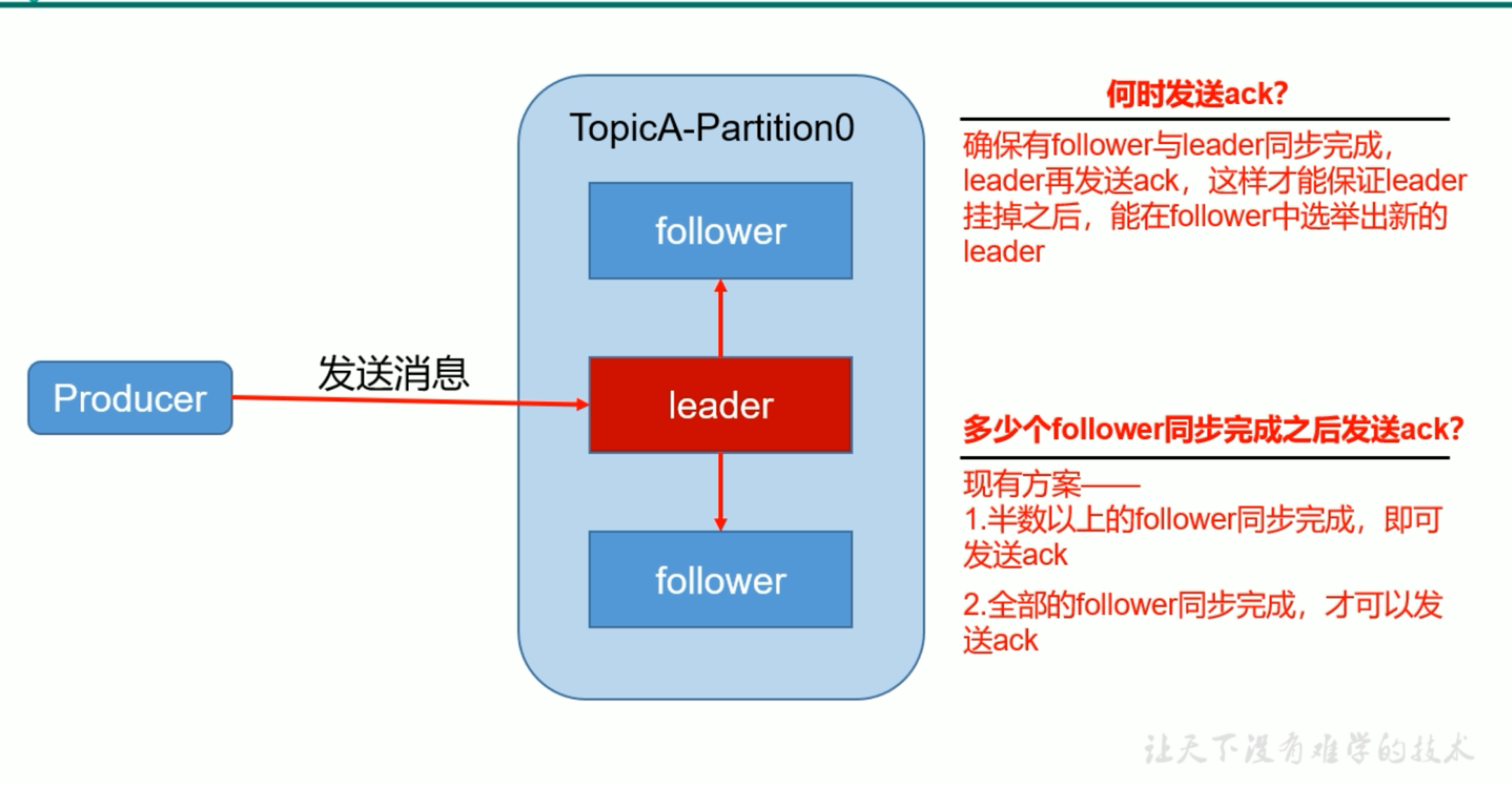 -1(all):producer等待broker的ack,partition的leader和follower全部落盘成功后才返回ack。但是如果在follower同步完成后,broker发送ack之前,leader发生故障,那么会