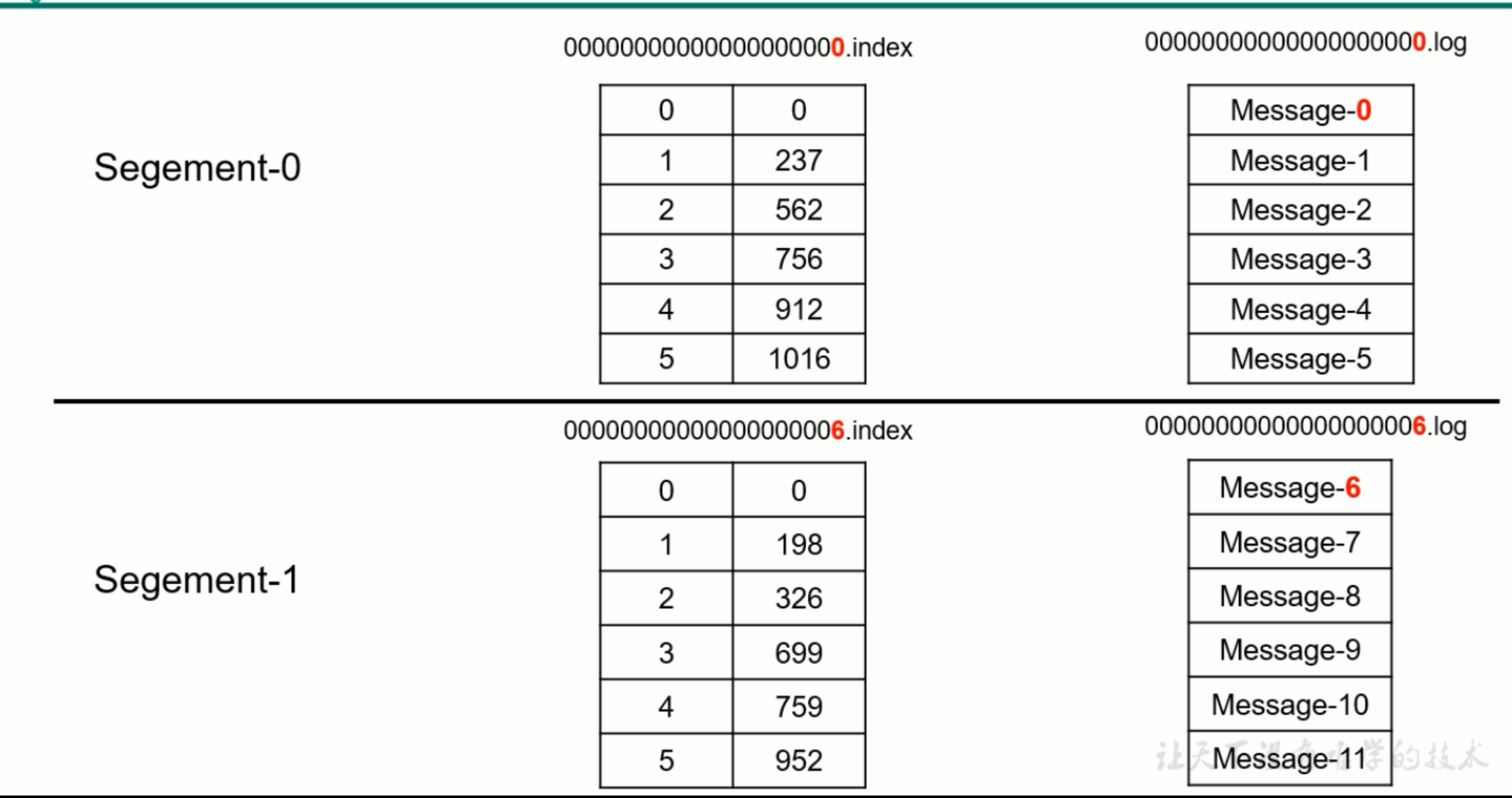“.index”文件存储大量的索引信息,“.log”文件存储大量的数据,索引文件中的元数据指向对应数据文件中message的物理偏移地址。比如1-237