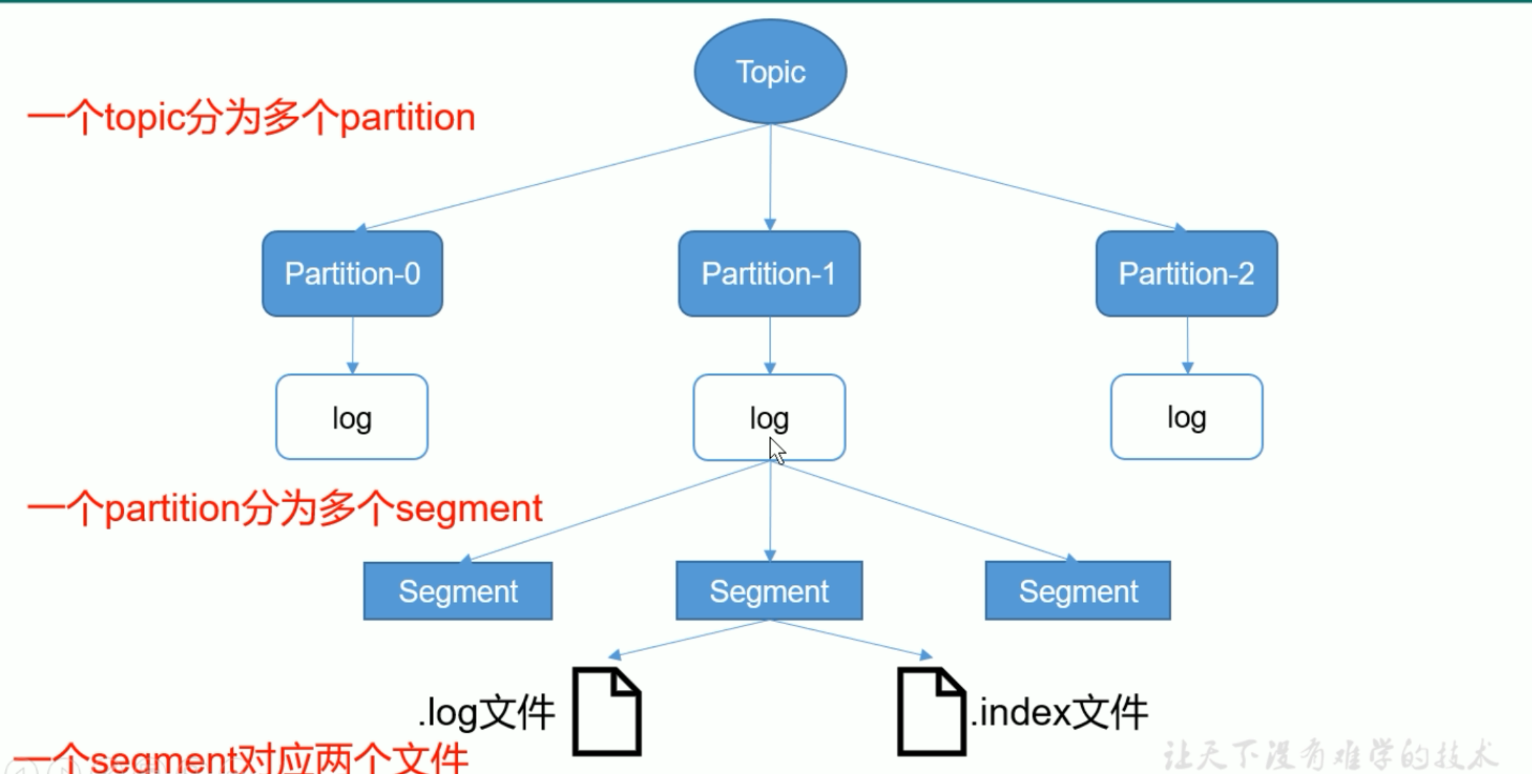 由于生产者生产的消息会不断追加到log文件末尾,为防止log文件过大导致数据定位效率低下,Kafka采取了分片和索引机制,将每个partition分为多个segment。每个segment对应两个文件——“.index”文件和“.log”文件。这些文件位于一个文件夹下,该文件夹的命名规则为:topic名称+分区序号。例如,first这个topic有三个分区,则其对应的文件夹为first-0,first-1,first-2。