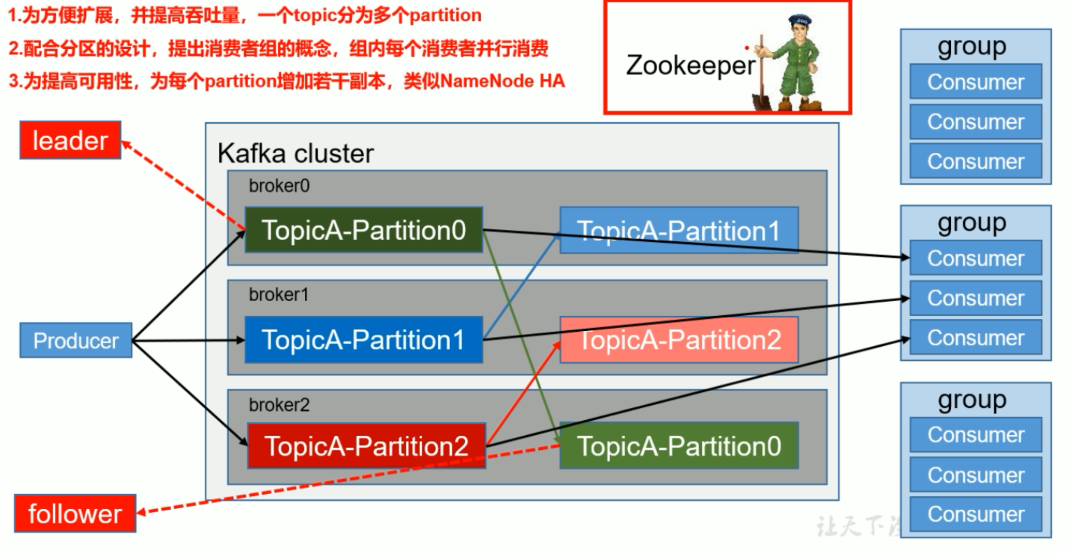 - leader:每个分区多个副本的“主”,生产者发送数据的对象,以及消费者消费数据的对象都是leader。